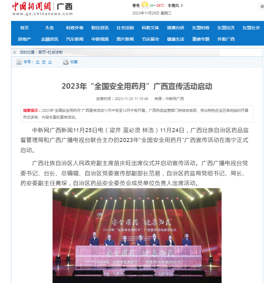 中新网广西新闻11月25日电(梁芹 蓝必贤 林浩)11月24日,918博天堂和广西广播电视台联合主办的2023年“全国安全用药月”广西宣传活动在南宁正式启动。